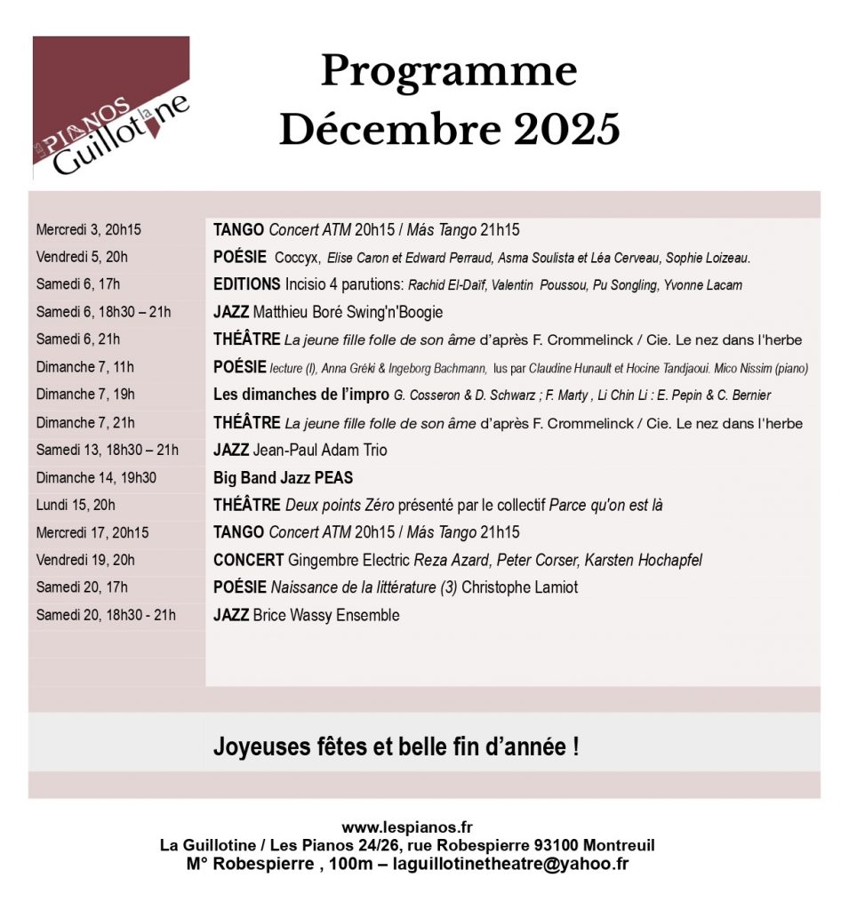 Dernier Télégramme événement n° 6 pour les 20 ans des éditions : Une Périphérie du Marché de la Poésie SAMEDI 14 JUIN 2025 / 16 H La Guillotine – Les Pianos / 26 rue Robespierre – 93100 Montreuil Kristell Loquet Mariano Rolando Andrade Frédérique Soumagne 3773 Christophe Manon |